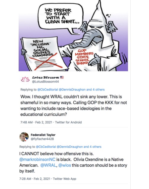 NBC News affiliate WRAL in Raleigh, North Carolina, published an editorial cartoon that portrays state school board members who oppose Black Lives Matter’s critical race theory curriculum as members of the KKK. Board member Olivia Oxendine, who opposes it, is an American Indian.